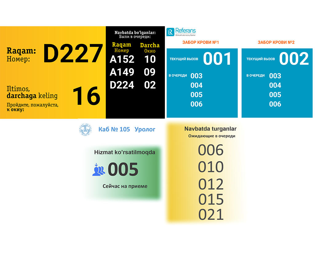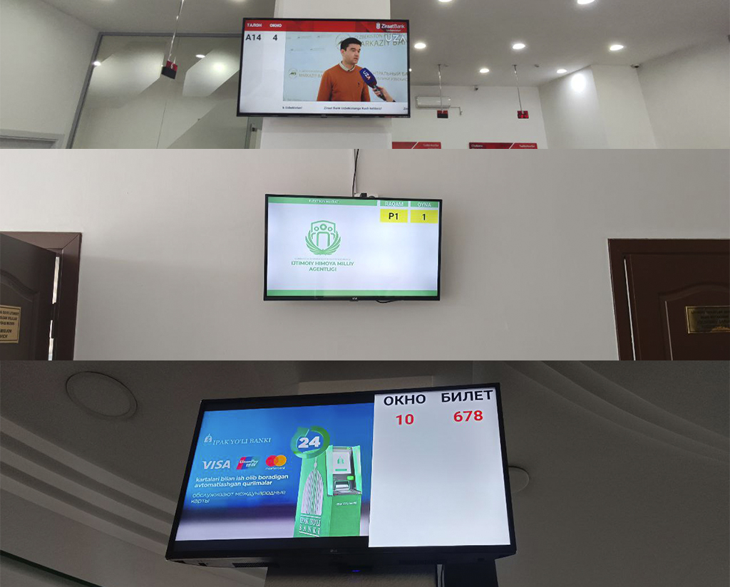• Banklar va filiallarda: mijoz navbat raqami va ularga xizmat ko'rsatiladigan oyna (operator raqami) bo'yicha ko'rsatish.